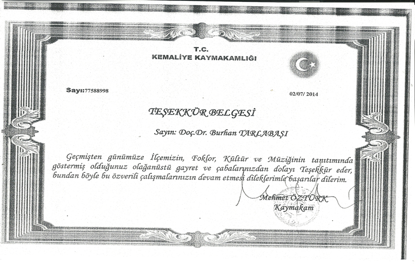 çalışma ve hizmetleri için TEŞEKKÜR BELGESİ,/O2 temmuz 2014 Kemaliye