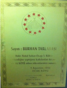 9 AĞUSTOS 1998 YILINDA KEMALİYE(EĞİN) OCAK KÖYÜ HIDIR ABDAL OCAĞI 5 NCİ KÜLTÜR ETKİNLİKLERİ ADINA TARAFIMA VERİLEN HİZMET ÖDÜLÜ