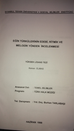 İ.T.Ü SOSYAL BİLİMLER ENSTÜTÜ ÖĞRENCİLERİNDEN KENAN ELMASA AİT " EĞİN TÜRKÜLERİNİN EDEBİ,RİTMİK VE MELODİK YÖNDEN İNCELENMESİ"KONULU YÜKSEK LİSANS TEZİ 24 HAZİRAN 1998-GÜMÜŞSUYU İSTANBUL-TEZ DANIŞMANI DOÇ.DR BURHAN TARLABAŞI